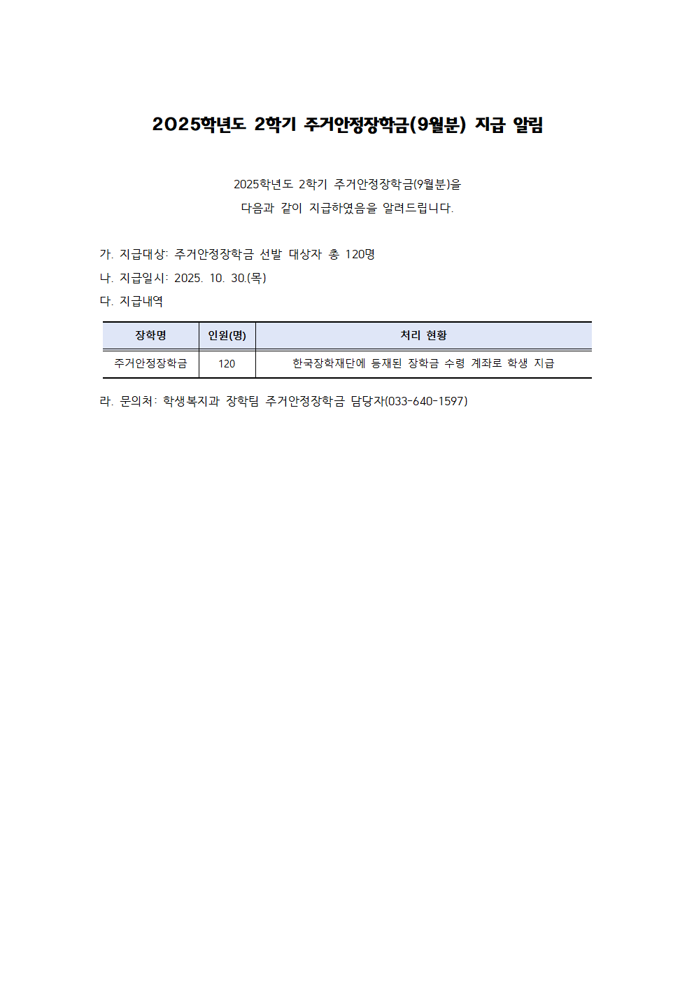 2025학년도 2학기 주거안정장학금(9월분) 지급 알림