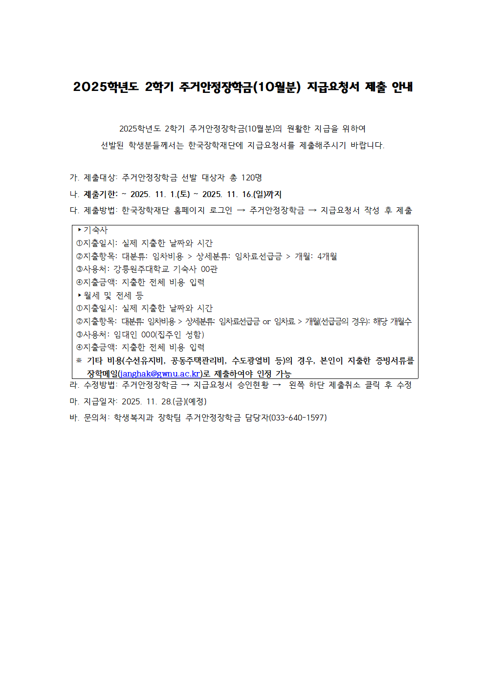 2025학년도 2학기 주거안정장학금(10월분) 지급요청서 제출 안내